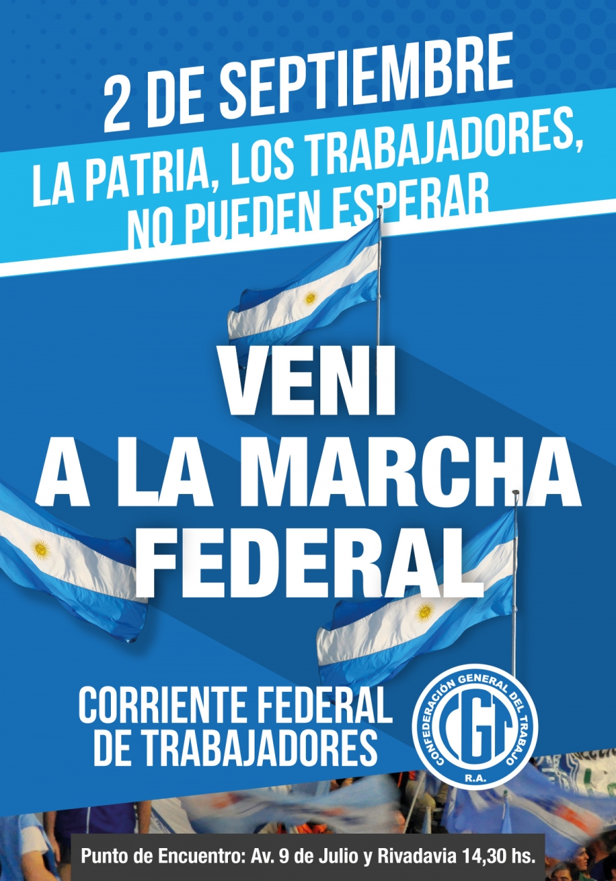 Marcha federal Este viernes 2 de septiembre, 14.30 hs., en 9 de Julio y Rivadavia. Más en esta categoría: « El escritor como trabajador La Patria, los trabajadores no pueden esperar » Tweet