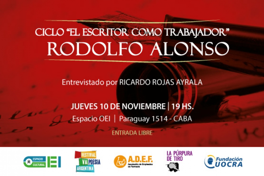 En el marco del ciclo "El escritor como trabajador”, el Secretario de Cultura de ADEF, Ricardo Rojas Ayrala, realizará una entrevista pública al escritor Rodolfo Alonso.